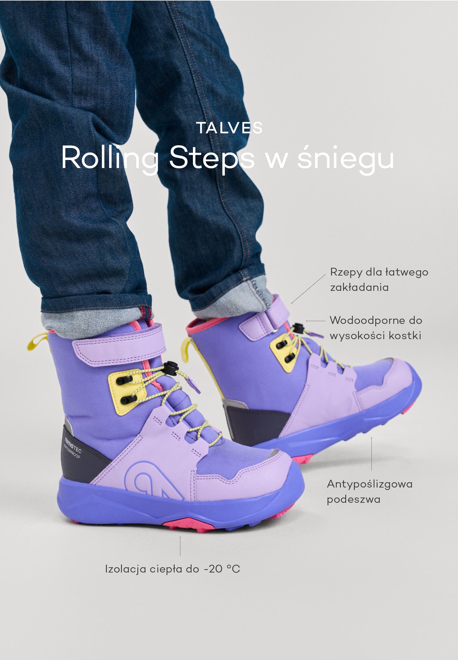 Talves to wodoodporne, ocieplone buty zimowe dla starszych dzieci łączące suchość, ciepło i dobrą przyczepność, z dodatkowymi elementami ułatwiającymi dopasowanie i poprawiającymi widoczność.