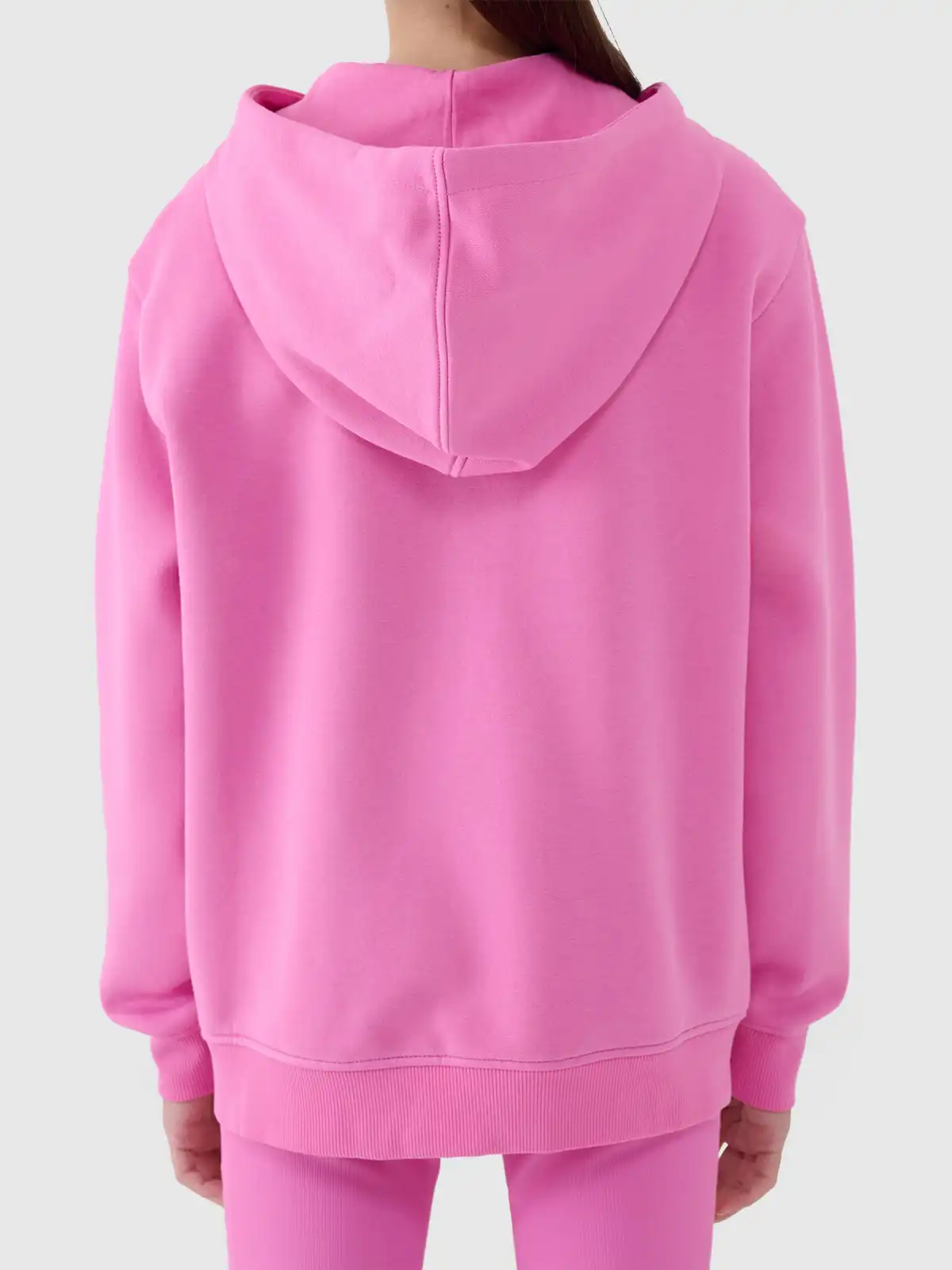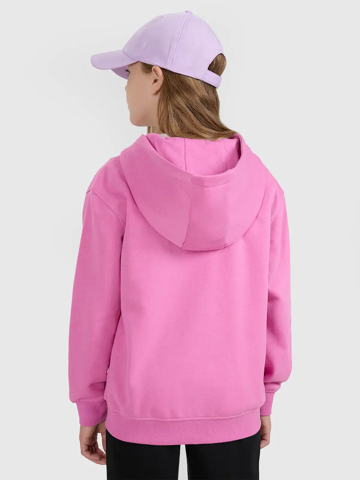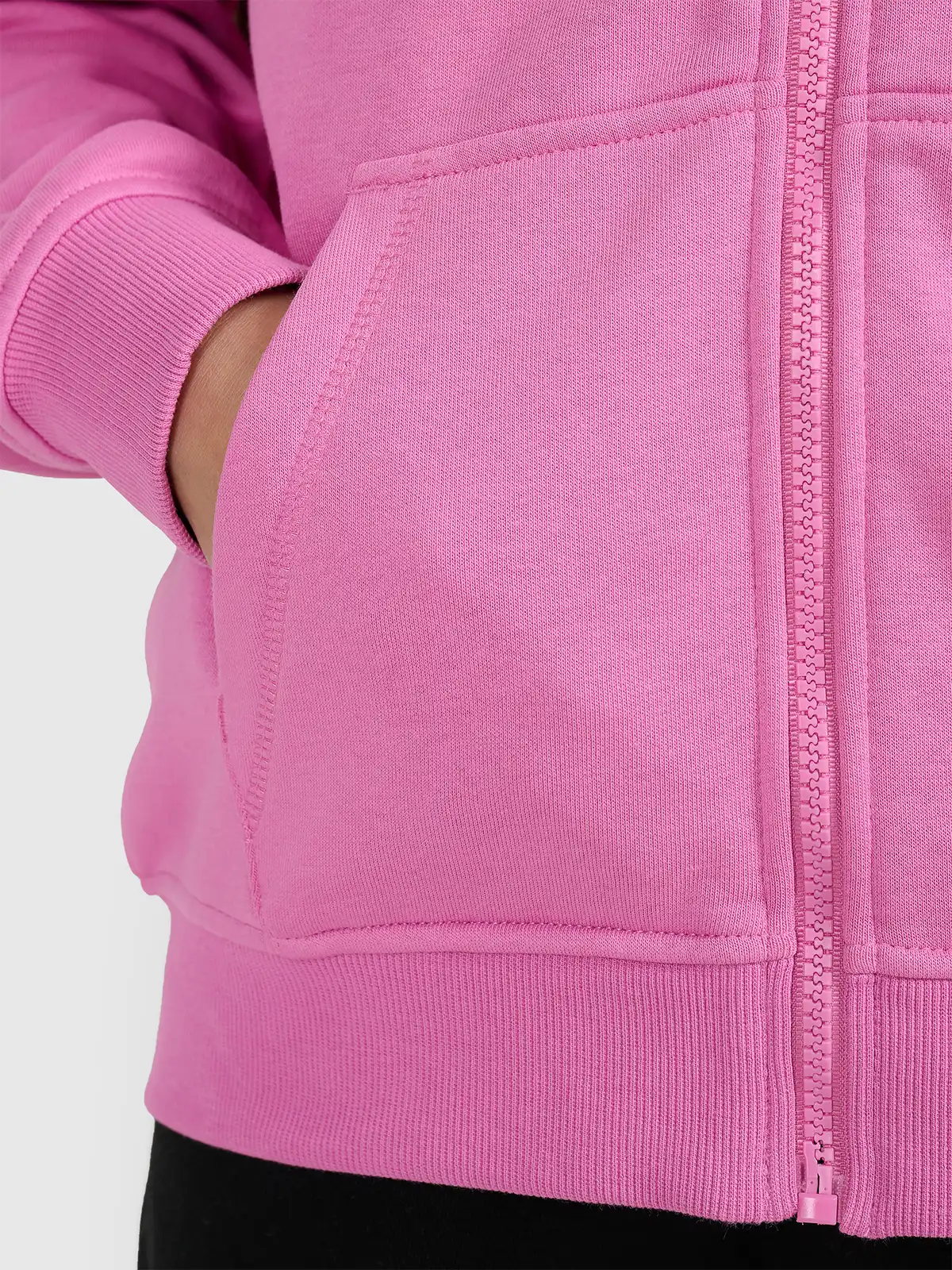 Bluza posiada pełny zamek ułatwiający szybkie zakładanie i zdejmowanie oraz praktyczny kaptur, który chroni przed wiatrem i chłodem. Wykonana z miękkiego, szczotkowanego od środka materiału, oferuje przyjemne uczucie ciepła bez nadmiernego przegrzewania. Elastyczne ściągacze przy rękawach i dole utrzymują ubranie na swoim miejscu podczas aktywności, a płaskie szwy zwiększają wygodę i trwałość. Dwie kieszenie typu kangurka pozwalają schować drobne przedmioty lub ogrzać dłonie. Elementy odblaskowe poprawiają widoczność po zmroku, co zwiększa bezpieczeństwo najmłodszych użytkowniczek.