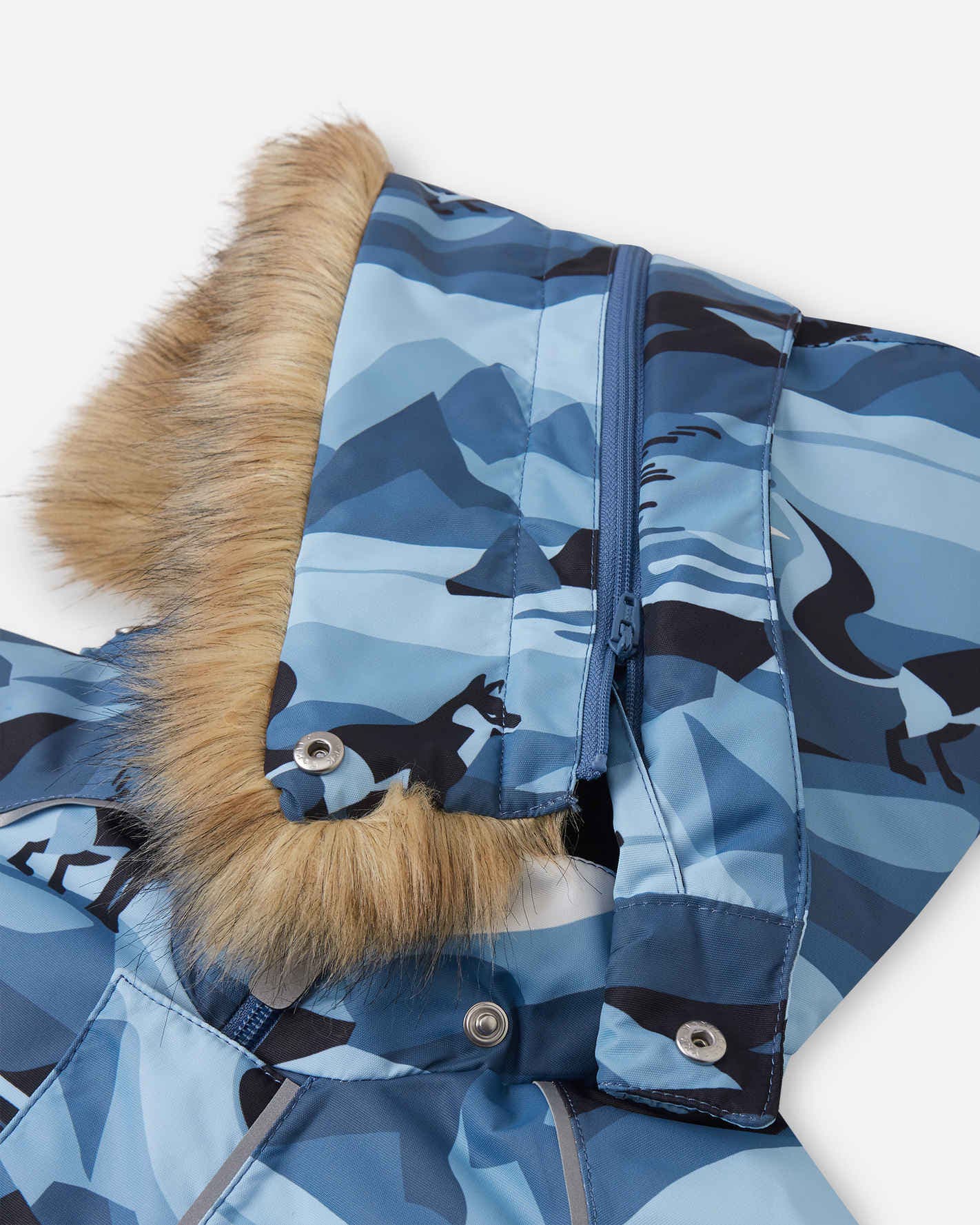 Całkowicie wodoodporny kombinezon zimowy Reimatec dla młodszych dzieci z nadrukami i odczepianym futerkiem. Z ociepleniem na pośladkach i długim suwakiem ułatwiającym ubieranie.