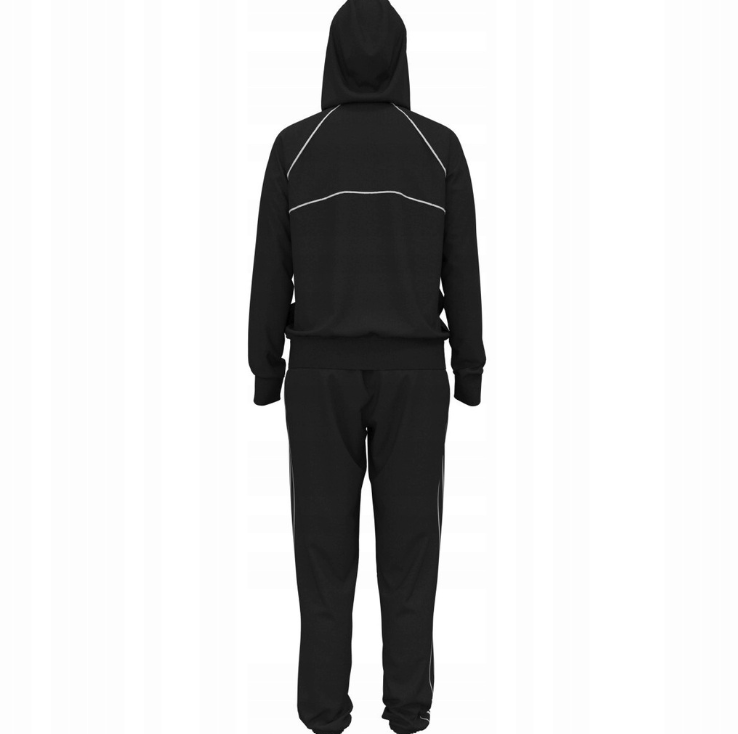 Bluza i spodnie wykonane są w technologii Rival Fleece - miękki splot typu fleece z szczotkowaną od wewnątrz powierzchnią, zapewniający przyjemne uczucie ciepła bez nadmiernego obciążenia. Materiał łączy naturalne włókna i włókna syntetyczne, dzięki czemu komplet oferuje właściwości izolacyjne, dobrą oddychalność oraz trwałość splotu. Konstrukcja uwzględnia ergonomię ruchu - bluza posiada dopracowany kaptur i kieszeń typu kangurka dla wygody, natomiast spodnie wyposażone są w elastyczny pas z regulacją i dopasowane ściągacze przy nogawkach, co utrzymuje komfort podczas dynamicznych ćwiczeń.