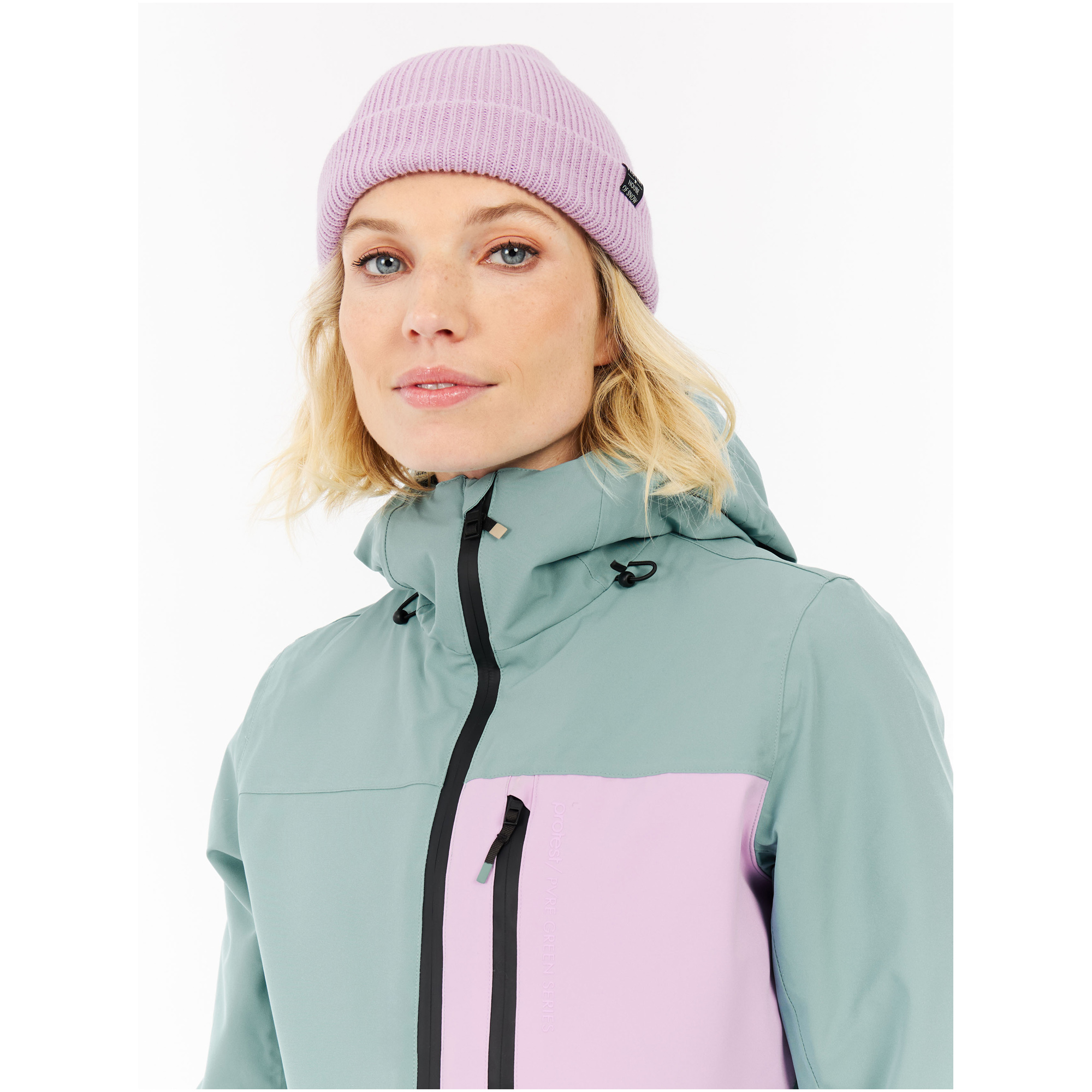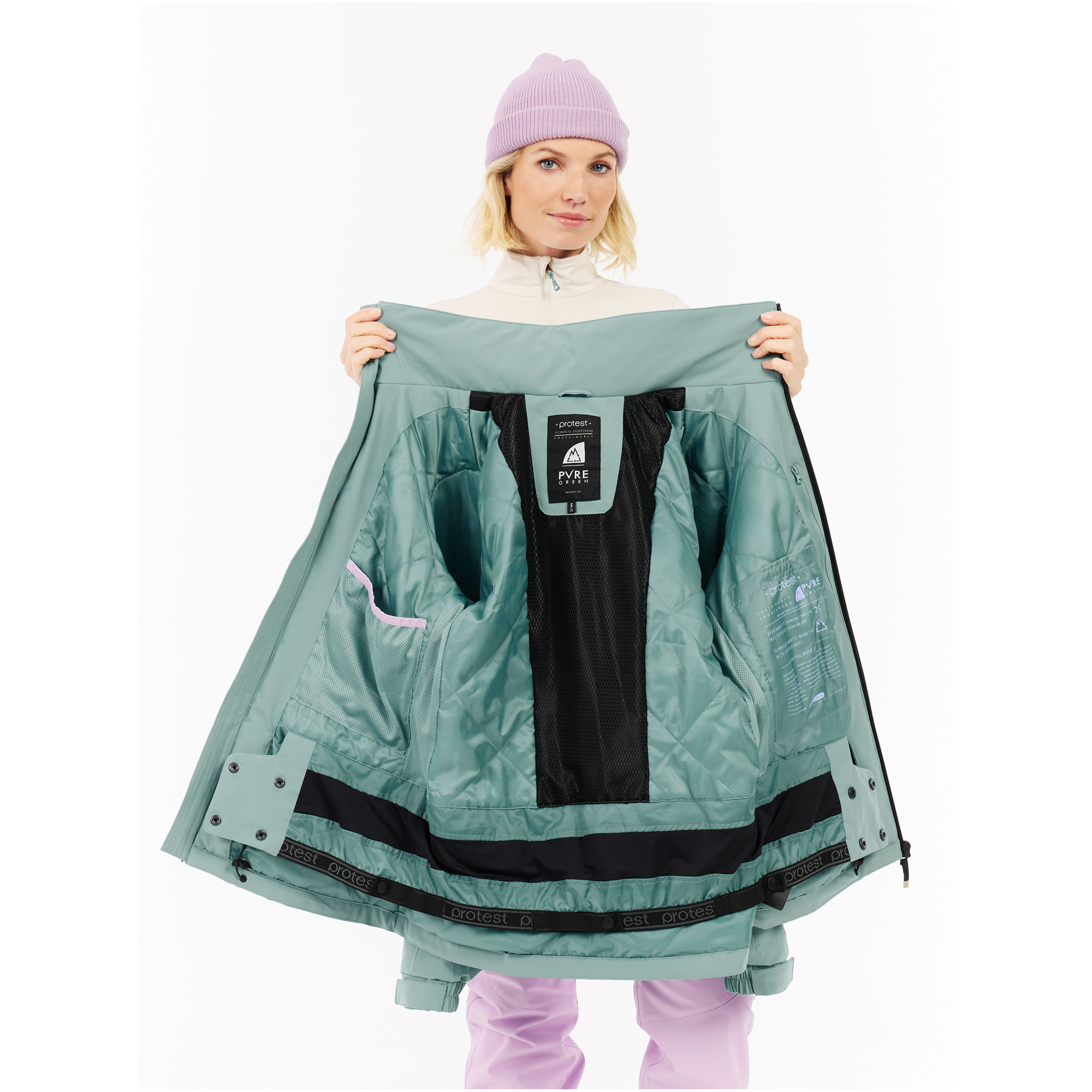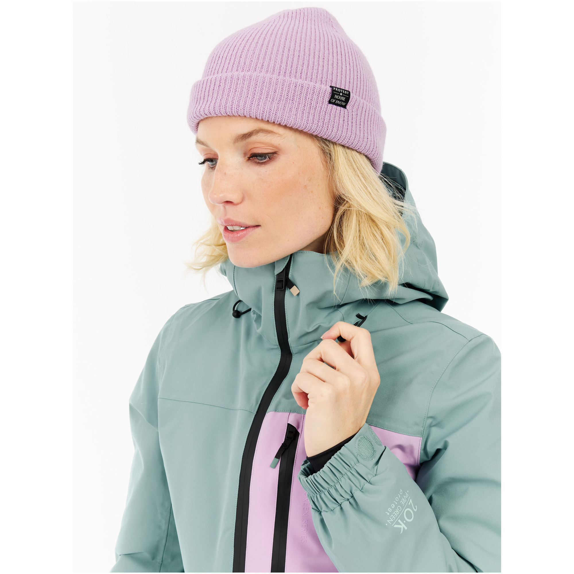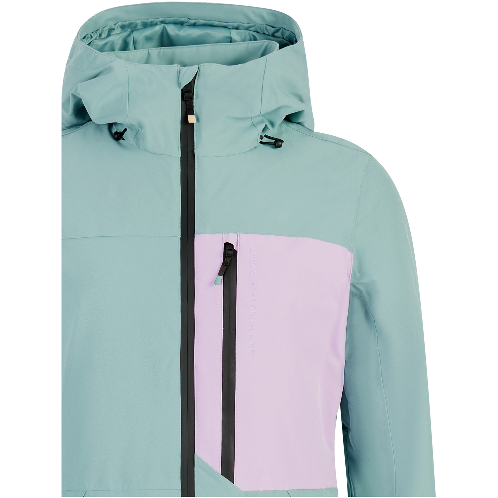 Kurtka wykorzystuje membranę TPU o parametrach 20 000 mm wodoodporności i 20 g oddychalności, co czyni ją skuteczną tarczą przeciw niepogodzie. Materiał PVRE Green z recyklingu jest wiatroszczelny i trwały, z hydrofobowym wykończeniem bez PFC. Stały regulowany kaptur i w pełni uszczelnione szwy zapobiegają wnikaniu śniegu, a odpinany pas pozwala dostosować styl. Idealna do jazdy freeride i snowboardu w zmiennych warunkach.