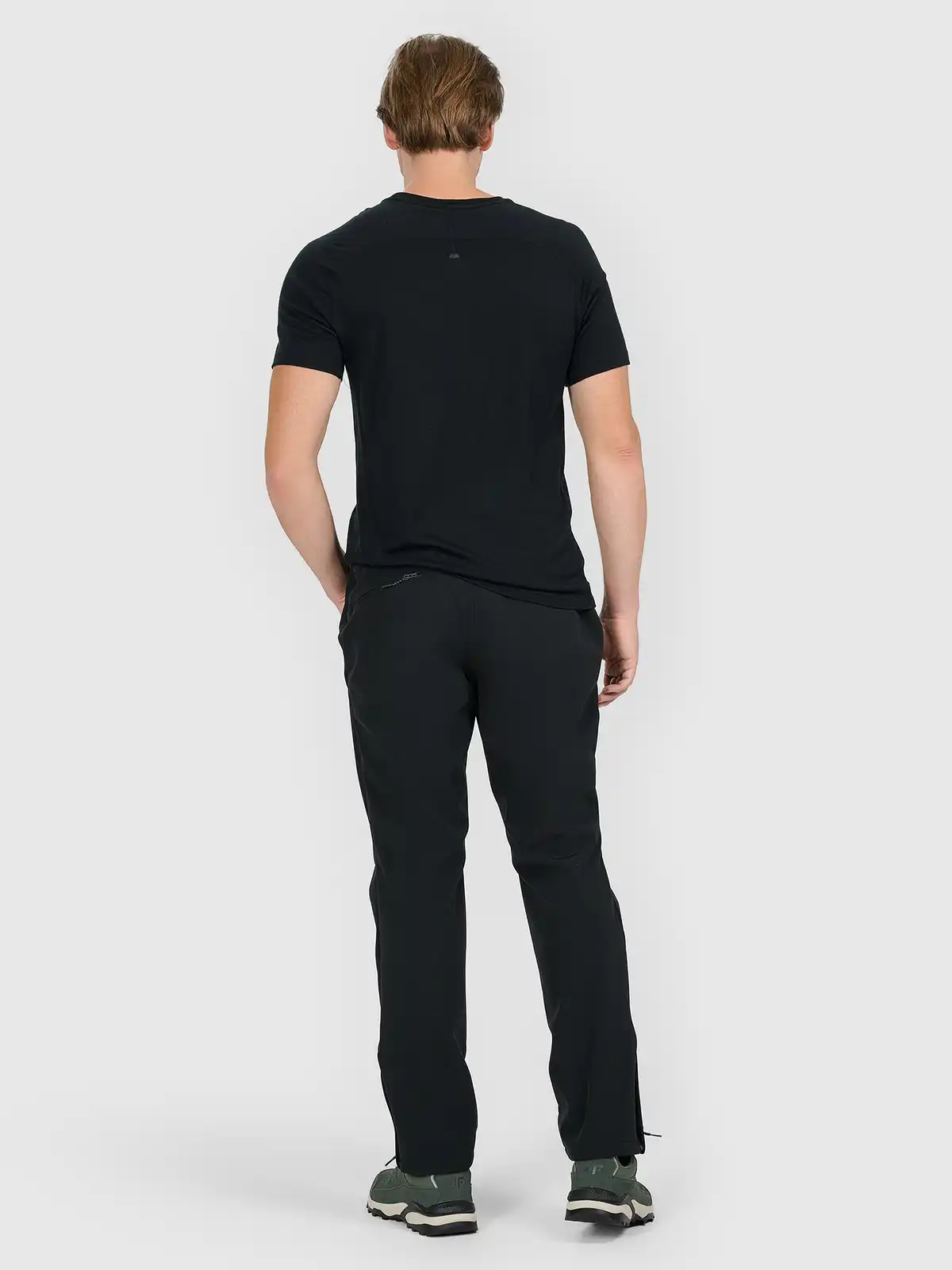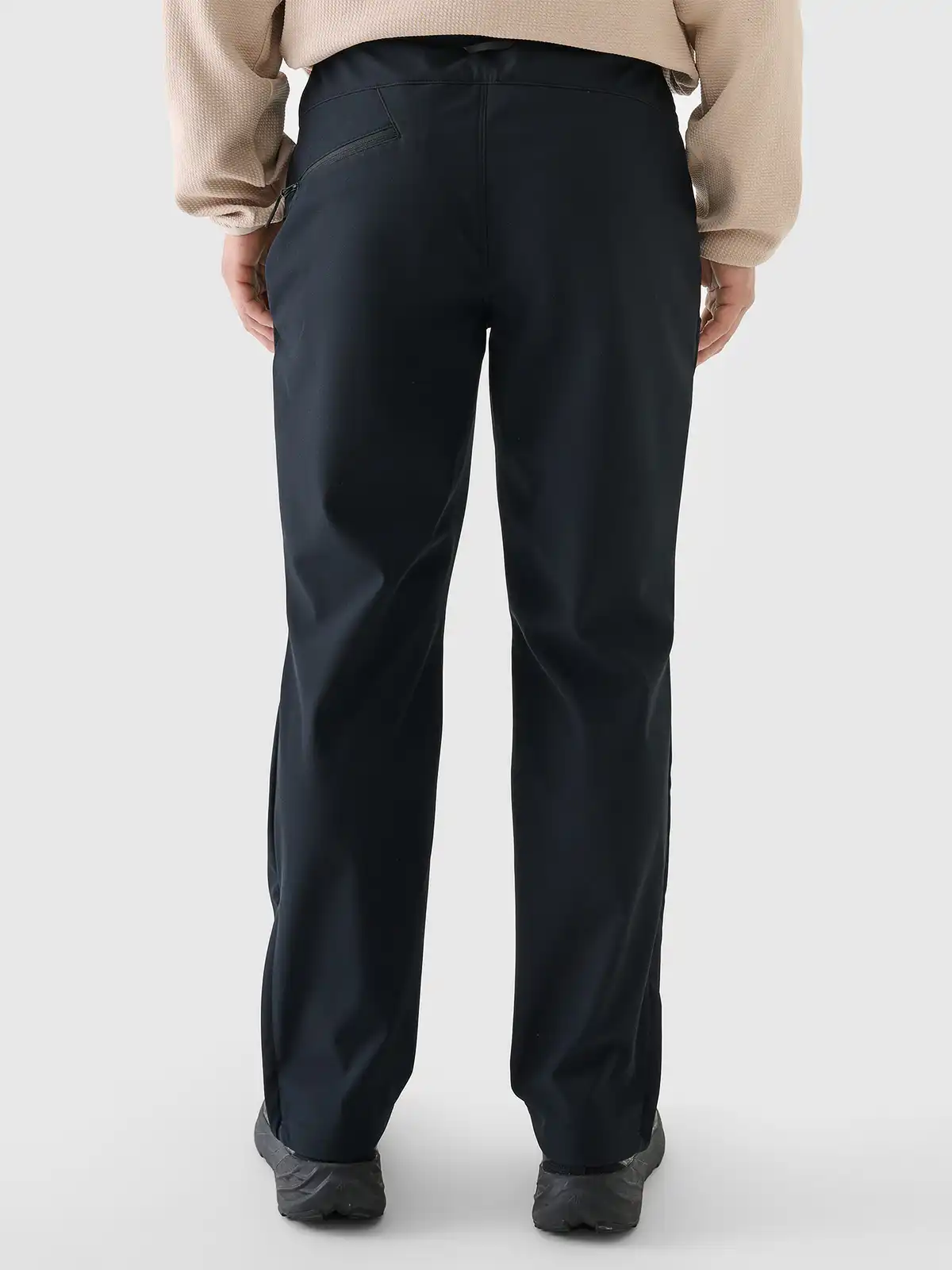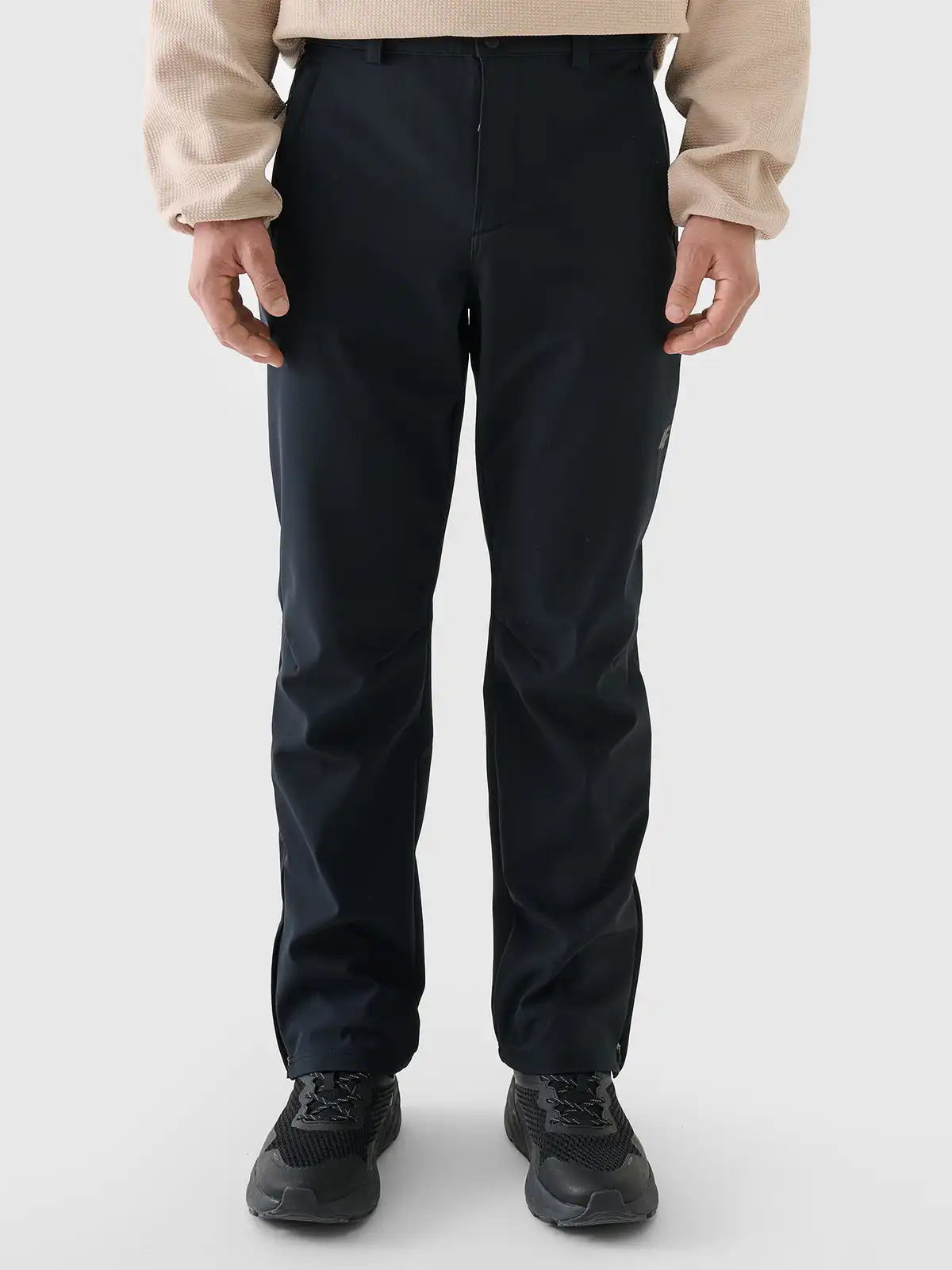 Wierzchnia warstwa wykonana z elastycznego softshellu zabezpiecza przed przeciągiem i lekkim deszczem, a wbudowana membrana zapewnia barierę wodno-wiatroszczelną przy jednoczesnym odprowadzaniu wilgoci na zewnątrz. Dodatkowa impregnacja hydrofobowa (DWR) ogranicza nasiąkanie materiału, a szczotkowana wewnętrzna warstwa poprawia komfort termiczny i przyjemne uczucie w kontakcie ze skórą. Profilowane kolana i elastyczne wstawki gwarantują swobodę ruchu, natomiast wzmacniane newralgiczne miejsca zwiększają odporność na przetarcia. Kieszenie zamykane zamkami chronią drobne przedmioty, a regulowany pas pozwala na dopasowanie do sylwetki i warstw odzieży noszonych pod spodem. Subtelne elementy odblaskowe poprawiają widoczność po zmroku.