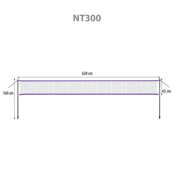 NT300 Nils, to siatka przeznaczona do rekreacyjnej gry w badmintona.Będzie świetnym dodatkiem, do wykorzystania przy klasycznych grach na świeżym powietrzu. Siatkę rozkłada i składa się w kilka minut, bez pomocy narzędzi.Produkt montuje się wbijając do ziemi słupki, które są stelażem, a do których przywiązujemy siatkę. Zarówno siatka jak i stelaż, są odporne na warunki atmosferyczne. Długość siatki to ponad 6 m, dlatego pozwala na swobodne rozegranie, dwóch meczy jednocześnie.Specyfikacja:
