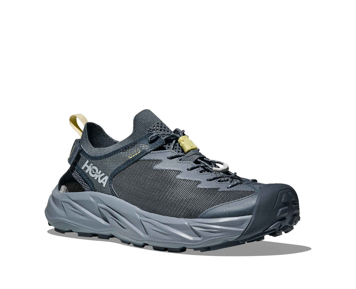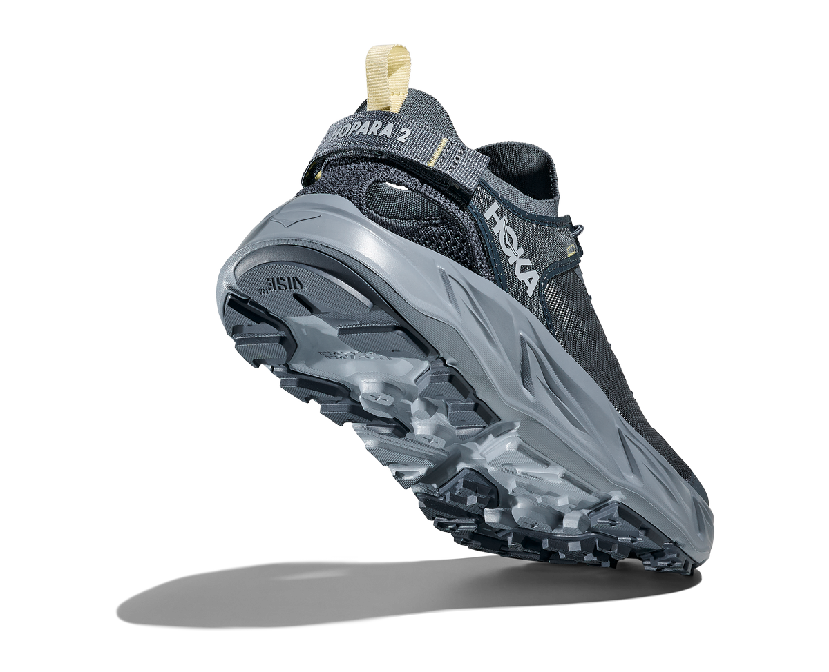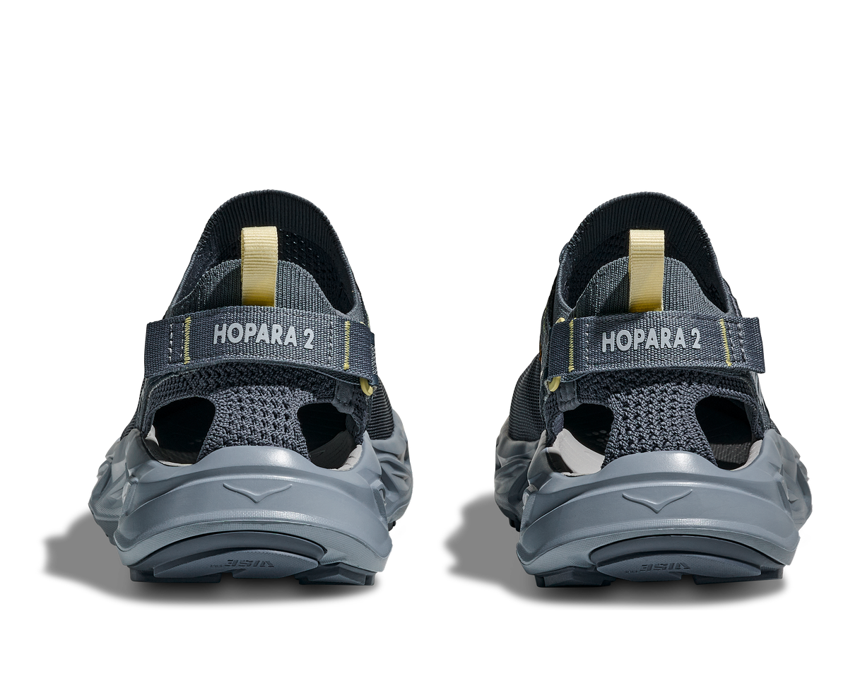 Sandały HOKA Hopara 2 w kolorze niebieskim (druzy/mountain fog) to zabudowane obuwie trekkingowe dla mężczyzn, łączące cechy sandałów i butów biegowych. Idealne na letnie wędrówki, pokonywanie strumieni, błotnistych terenów i skalistych szlaków. Zapewniają stabilność, ochronę przed zanieczyszczeniami i komfort przez cały dzień.