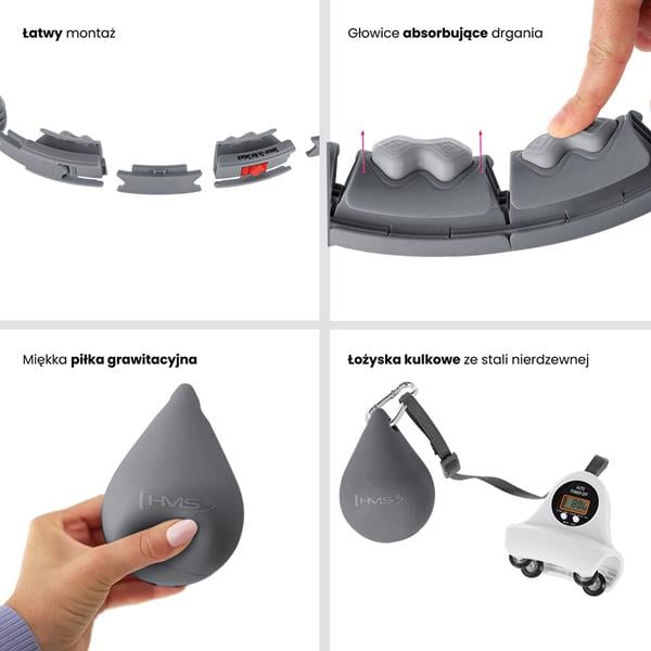 Hula-hop HMS HHW06 zbudowany z trwałych materiałów PVC, ABS, PP i TPR obraca się płynnie dzięki łożyskom kulkowym ze stali nierdzewnej. Wypustki absorbują wstrząsy, umożliwiając komfortowy masaż i wzmocnienie mięśni brzucha. Piłka grawitacyjna z regulowanym paskiem (20-38 cm) dostosowuje trudność, idealna do ćwiczeń w domu na redukcję tkanki tłuszczowej i ujędrnienie sylwetki. Pas BR163 uzupełnia trening, stabilizując talię w rozmiarach plus size.