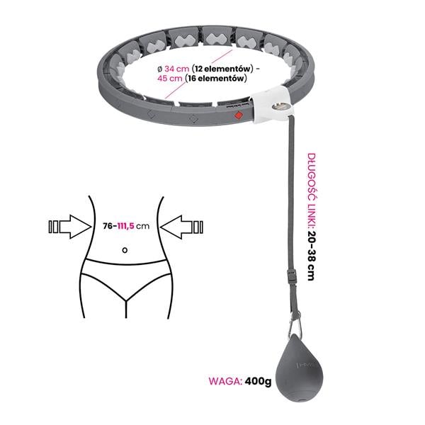 - Regulacja obwodu: 12-16 elementów, talia 76-111,5 cm, średnica zewnętrzna 35-45 cm
