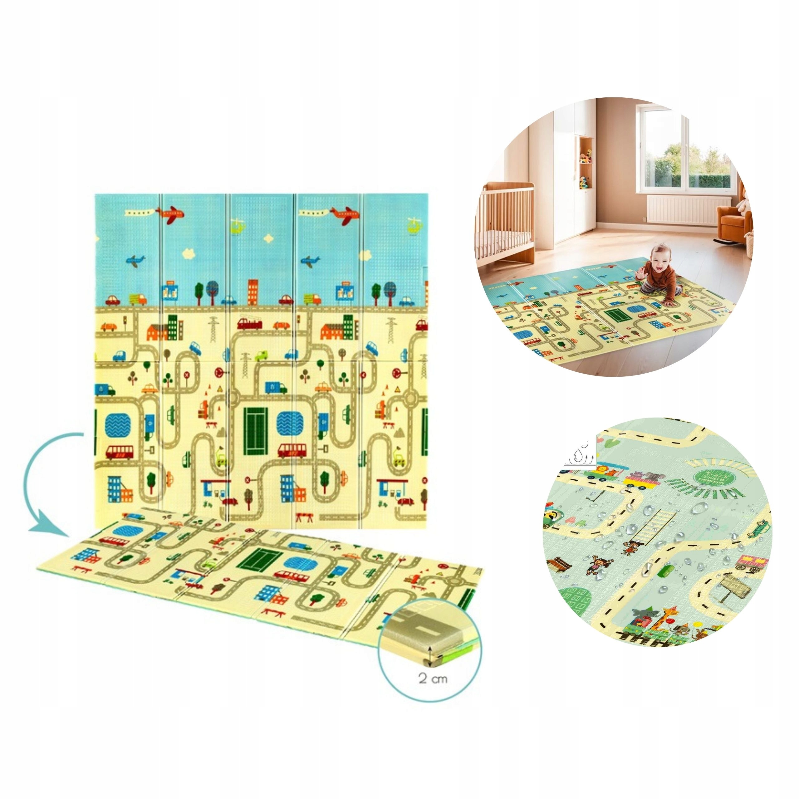 Mata wykonana z pianki XPE zapewnia amortyzację i izolację od zimnej podłogi, co jest szczególnie ważne podczas zabawy niemowląt i małych dzieci. Grubość 1 cm stanowi optymalny kompromis między ochroną a mobilnością. Dwustronna budowa maty pozwala na zmianę scenerii bez konieczności kupowania dodatkowych produktów – jedna strona prezentuje motywy City, druga oferuje alternatywny wzór. Antypoślizgowa powierzchnia zapobiega przesuwaniu się maty podczas aktywnej zabawy, a łatwa w czyszczeniu pianka XPE sprawdza się zarówno w domu, jak i w podróży.