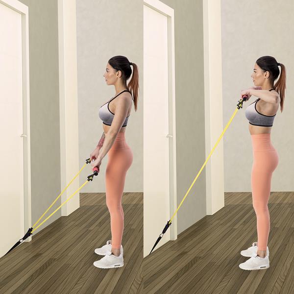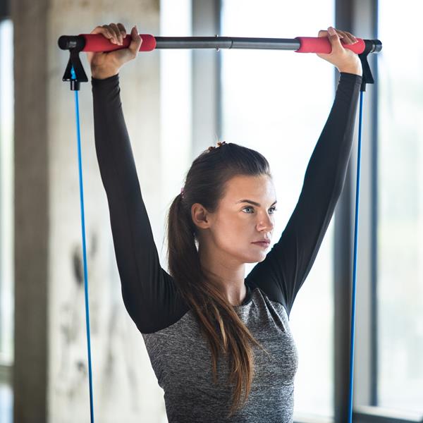 Drążek z połączonymi gumami oporowymi umożliwia wykonanie szerokiej gamy ćwiczeń pilatesu, siłowych i rehabilitacyjnych. Gumy w kolorach niebieskim (10 kg), żółtym (15 kg) i czerwonym (20 kg) zapewniają progresję obciążenia. Akcesoria jak uchwyty na kostkę, stopy i pod drzwi pozwalają na różnorodne warianty treningu w domu, bez potrzeby dodatkowego sprzętu. Składana konstrukcja ułatwia transport i przechowywanie.