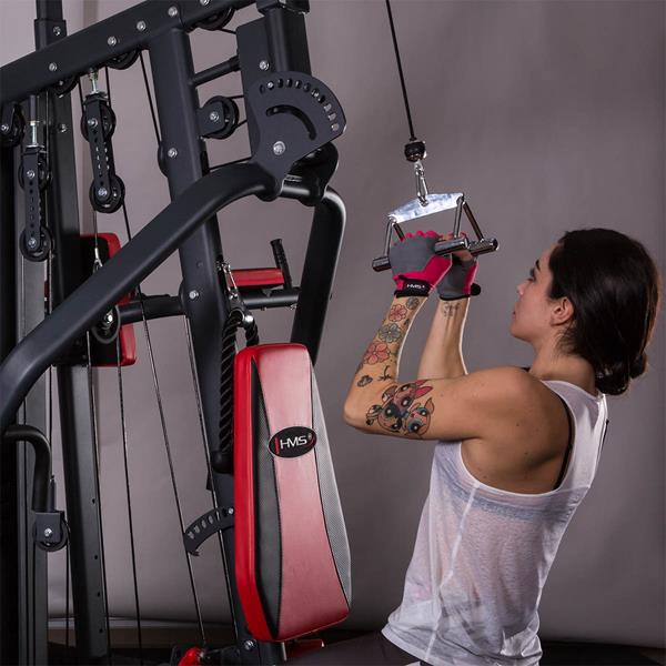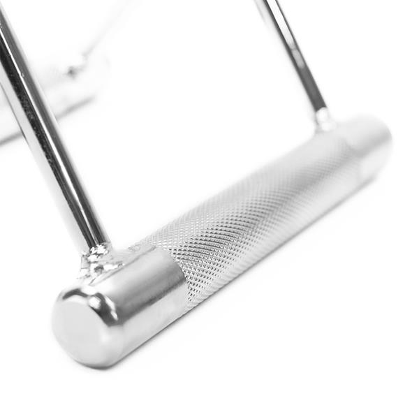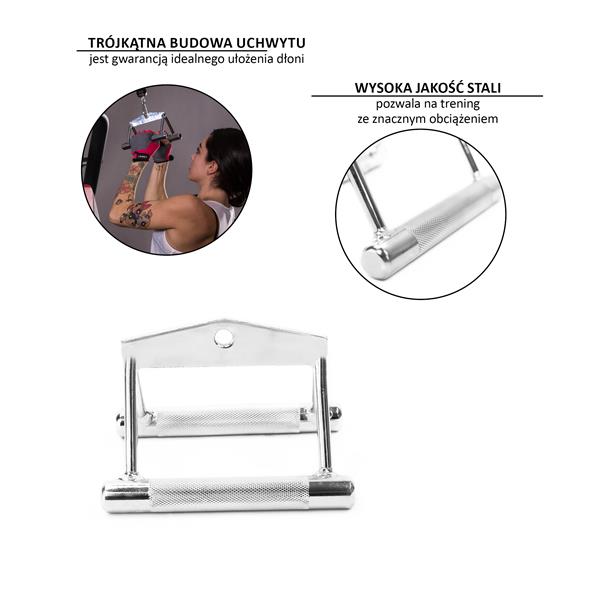 UW05 HMS to podwójny uchwyt stworzony do treningu na wyciągu górnym i dolnym, a także do ćwiczeń z połową sztangi. Jego trójkątna konstrukcja i ergonomiczna budowa ułatwiają prawidłowe ułożenie dłoni i prowadzenie ruchu, co jest szczególnie istotne podczas ćwiczeń na mięśnie grzbietu, takich jak wiosłowanie sztangą w opadzie tułowia. Dzięki stalowej, radełkowanej rękojeści, uchwyt zapewnia mocny i pewny chwyt, co zapobiega wyślizgnięciu się z ręki i jednocześnie angażuje mięśnie przedramion.