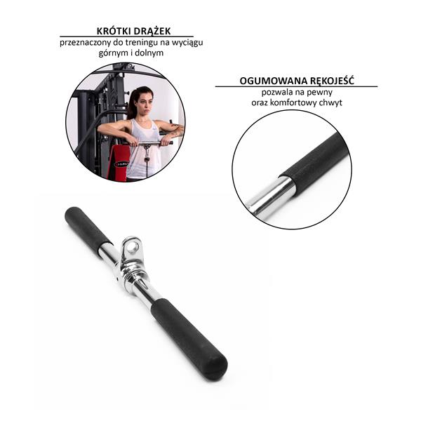UW12 HMS to krótki drążek przeznaczony do treningu na wyciągu górnym i dolnym. Można wykorzystać go co całej gamy ćwiczeń na różne grupy mięśniowe górnych partii ciała, zaczynając od małych grup mięśniowych, jak biceps i triceps, przez przedni i boczny akton mięśni naramiennych, aż po mięśnie najszersze oraz prostownik grzbietu.