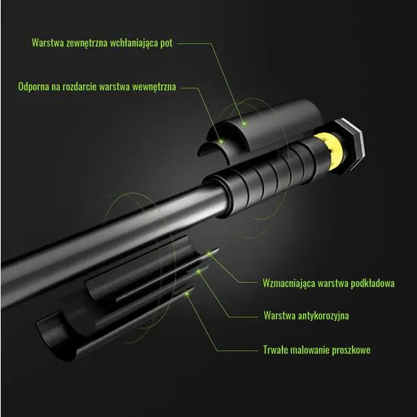 - Komfort użytkowania: Uchwyty pokryte specjalnym materiałem absorbującym pot, który zapobiega ślizganiu się dłoni.