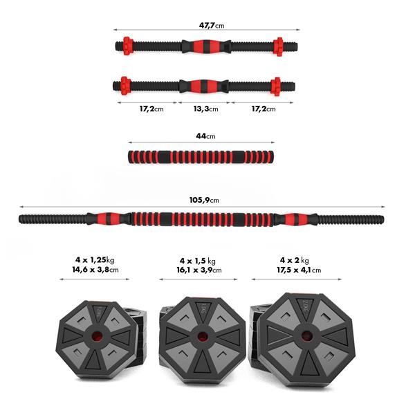 Zestaw zbudowany z dwóch prostych gryfów o długości 47,7 cm, łącznika i 12 talerzy o wagach 1,25 kg, 1,5 kg i 2 kg. Obciążniki z PVC wypełnione cementem zapewniają stabilność i ochronę powierzchni. Idealny do ćwiczeń takich jak wyciskanie, wiosłowanie czy martwy ciąg w warunkach domowych.Okiem eksperta