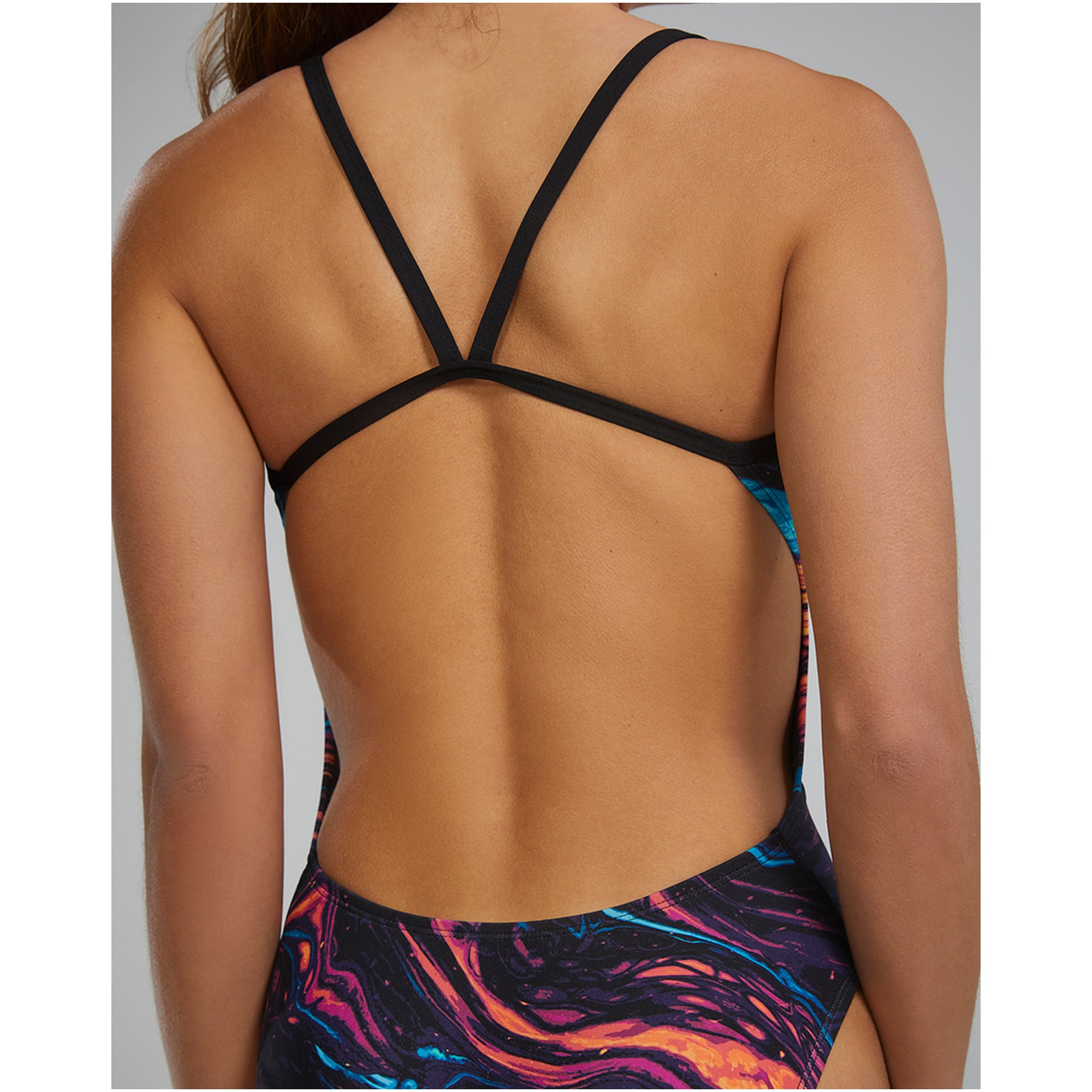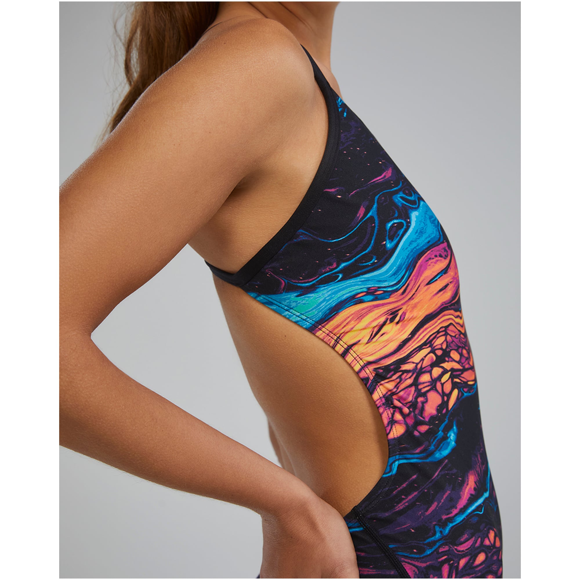 Tkanina Durafast Elite® wyróżnia się zwiększoną odpornością na chlor, co pozwala kostiumowi zachować swoją elastyczność i kolor nawet po intensywnych treningach. Materiał nie traci swoich właściwości kompresyjnych, wspierając naturalny ruch ciała w wodzie. Otwarty tył i wysoko wycięte nogawki umożliwiają pełną mobilność ramion i nóg, co jest szczególnie ważne dla pływaczek trenujących różne style pływania. Niski dekolt i cienkie ramiączka nie ograniczają zakresu ruchu.
