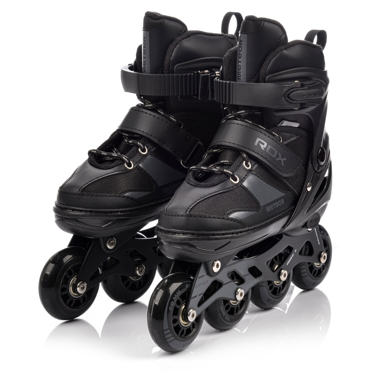 Regulowane rolki Meteor Rox S w rozmiarze 30-33 idealnie sprawdzą się u dzieci początkujących w jeździe rekreacyjnej. Dzięki kauczukowym kołom i solidnej konstrukcji zapewniają stabilność na asfalcie i kostce brukowej.