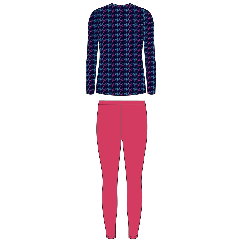 Komplet bielizny dziecięcej składający się z dopasowanych spodni i topu, zaprojektowany jako pierwsza warstwa odzieży termicznej. Przeznaczony dla dzieci uprawiających sporty zimowe oraz do codziennych aktywności na mrozie, zapewnia komfort termiczny i swobodę ruchów podczas zabawy, jazdy na nartach czy spacerów w chłodniejsze dni.