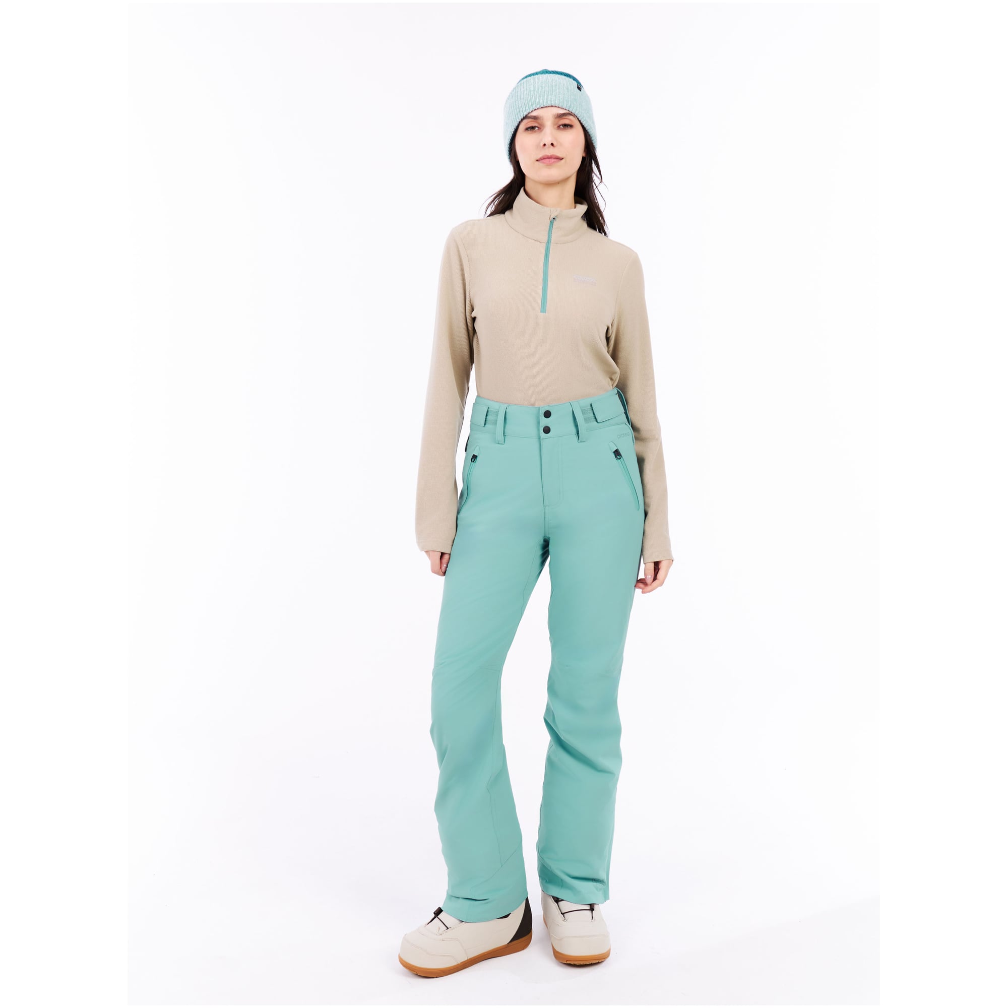 Materiał główny z 100% poliestru z membraną bez PFC zapewnia wodoodporność i oddychalność. Krytycznie klejone szwy uszczelniają połączenia, a rozciągliwy materiał slim fit pozwala na pełną swobodę ruchów podczas skrętów i skoków. Spodnie sprawdzają się na stokach narciarskich i snowboardowych w umiarkowanie trudnych warunkach pogodowych.