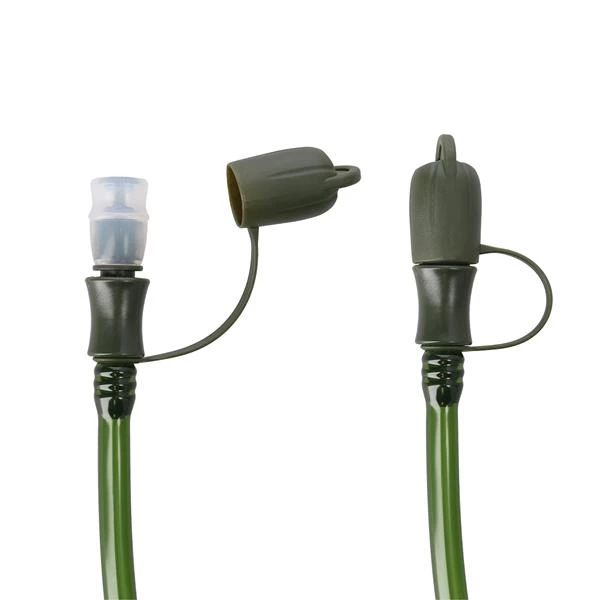 Bukłak wyposażony jest w rurkę o długości 1 metra z ustnikiem, którą można poprowadzić przez pas naramienny plecaka, zapewniając dostęp do wody bez konieczności zdejmowania plecaka. Montaż w kompatybilnym plecaku jest intuicyjny – wystarczy włożyć bukłak do dedykowanej kieszeni hydro, unieruchomić za pomocą pasków i odpowiednio poprowadzić rurkę. Konstrukcja z materiałów PEVA, PP i PVC zapewnia trwałość i odporność na warunki polowe.