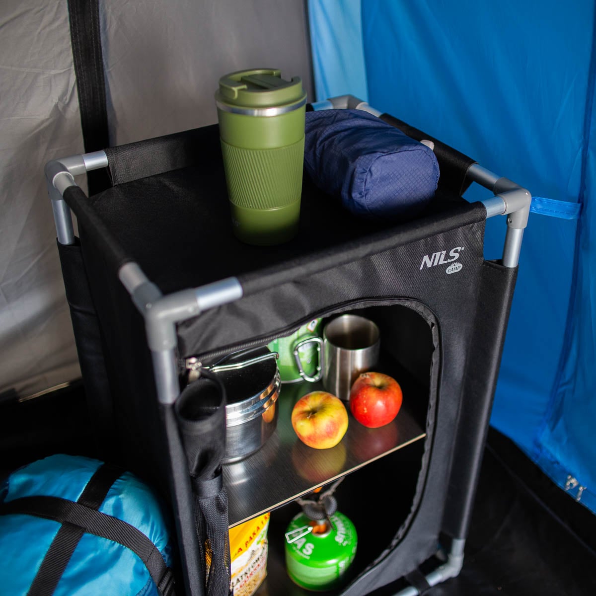 Szafka składa się z solidnego stelaża z aluminiowych profili o średnicy 19 mm, obitego materiałem 600D Oxford z elementami PVC i płytami MDF na półkach. Siatka na froncie zabezpiecza żywność przed owadami, poprawia cyrkulację powietrza i ułatwia dostęp. Idealna do kempingu, pikników czy tymczasowego przechowywania w garażu – nie do użytku komercyjnego.Okiem eksperta