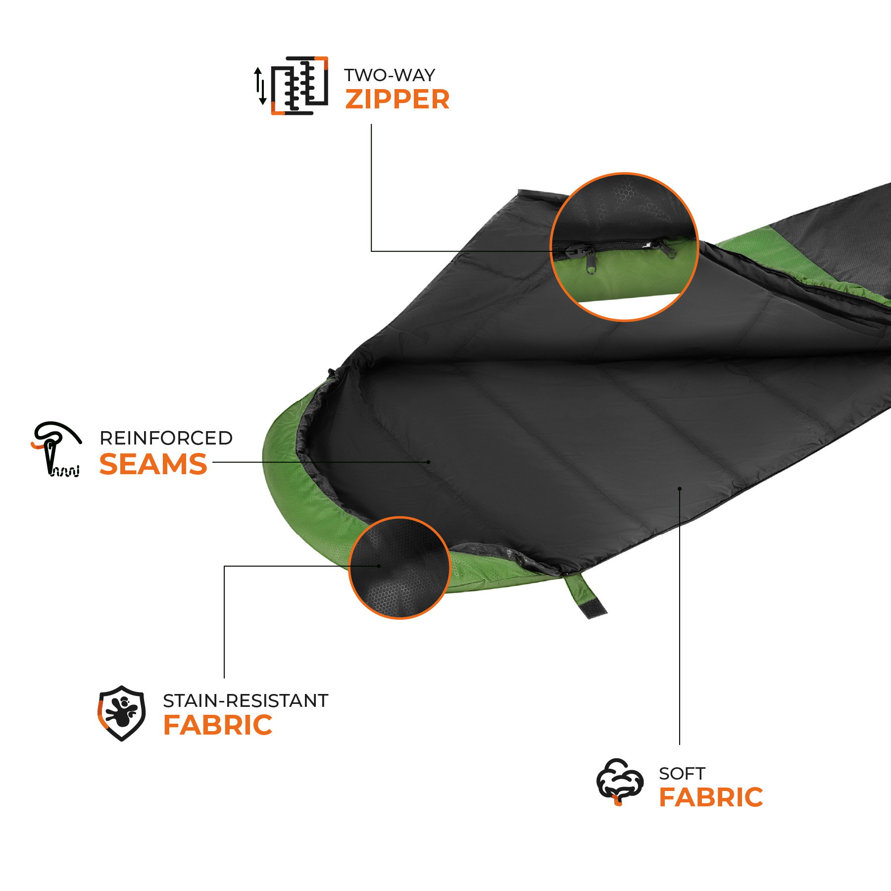 - Dwustronny zamek umożliwia wentylację i łączenie z drugim śpiworem.