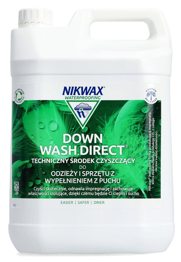 Nikwax Down Wash Direct został zaprojektowany specjalnie do czyszczenia puchu hydrofobowego i zwykłego. Formuła na bazie wody nie pozostawia przyciągającego wodę osadu, w przeciwieństwie do standardowych detergentów. Produkt można stosować w pralce automatycznej (do odzieży) lub ręcznie (do większych przedmiotów, takich jak śpiwory). W przypadku trudnych zabrudzeń można go również stosować bez rozcieńczania jako wywabiacz plam i tłuszczu przed praniem. Po wypraniu zalecane jest trzykrotne odwirowanie na niskich obrotach, co pomaga w rozłożeniu grudek puchu i przywróceniu jego puszystości. Jeśli wyroby puchowe są często używane lub były wcześniej prane zwykłymi detergentami, po czyszczeniu Down Wash Direct zalecana jest dodatkowa impregnacja preparatem Nikwax Down Proof w celu nadania nowej powłoki DWR.